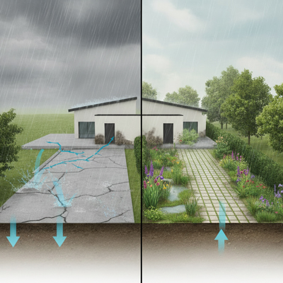 - Prévoir pavés drainants, noues, bassins tampons, toitures végétalisées et systèmes de récupération d’eau de pluie (arrosage, WC, entretien).